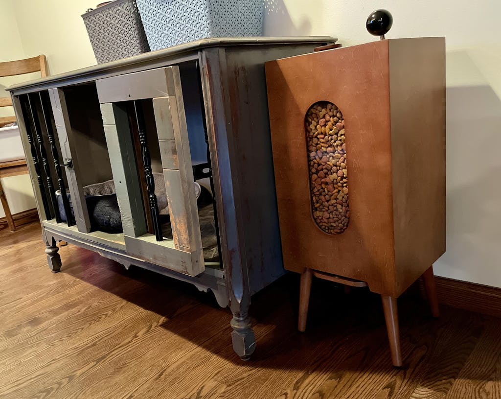 The kibble dispenser has clean, simple lines and beautifully fuses wood, plastic, and metal to produce a statement piece in your home.